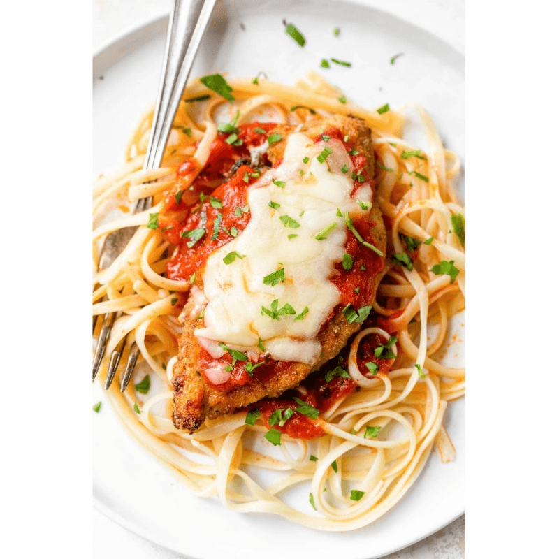 Crispy, breaded chicken breast topped with marinara and melted mozzarella. Served over penne pasta and paired with warm garlic bread