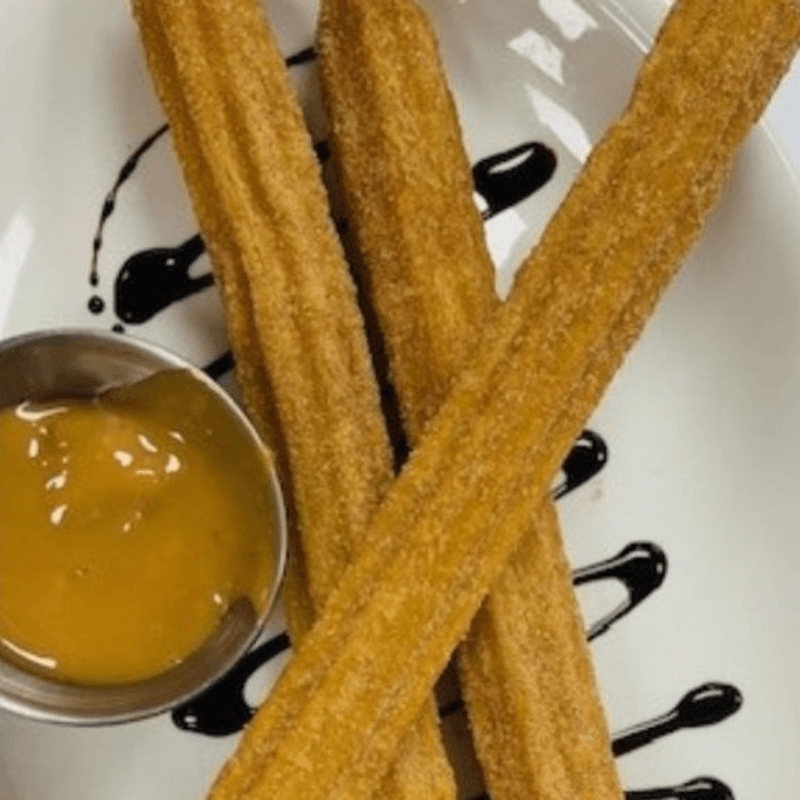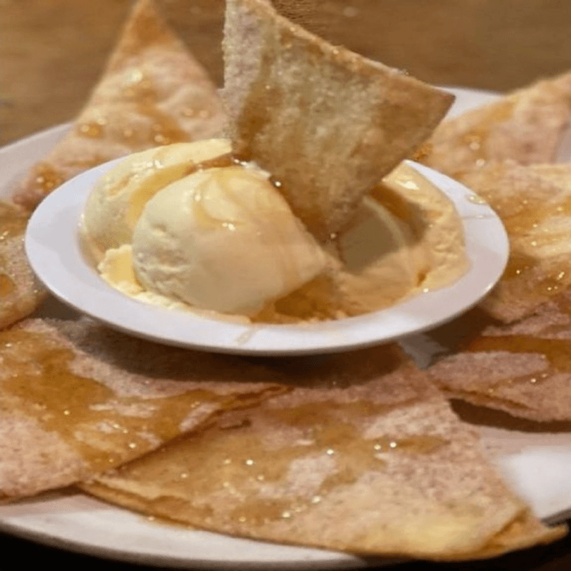 Freshly fried flour chips dipped in cinnamon and sugar, drizzled with honey and served with vanilla ice cream
