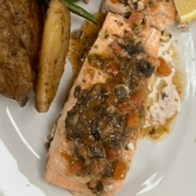 Broiled in lemon, white wine, and butter, then topped with onions, tomatoes, herbs, and a touch of golden breadcrumbs