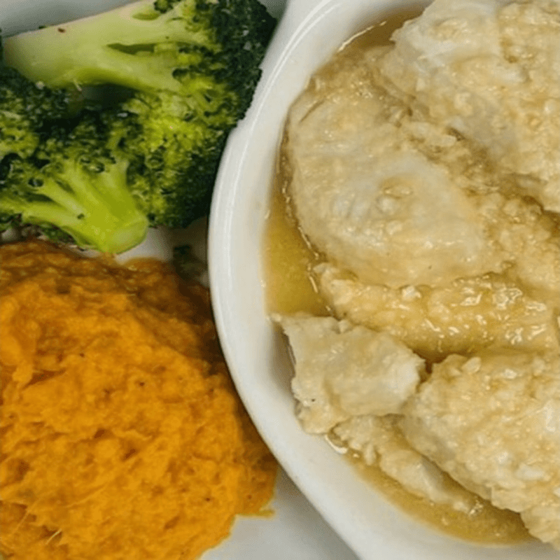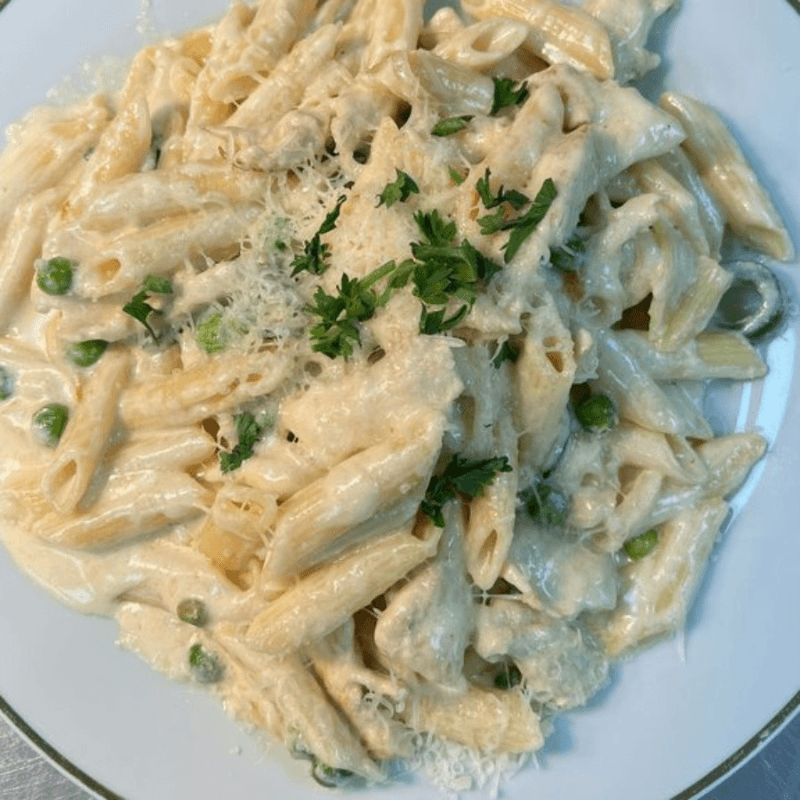 Chicken breast simmered in a rich gorgonzola cream sauce with sautéed mushrooms, sweet peas, and poblano peppers. Served over penne pasta, topped with Parmesan, and paired with warm garlic bread