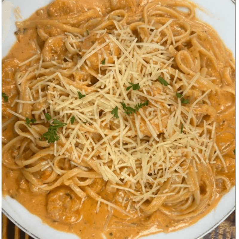 Linguine pasta topped with succulent shrimp in grandma’s creamy vodka sauce. Serve with garlic bread