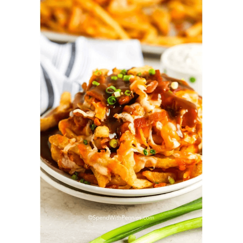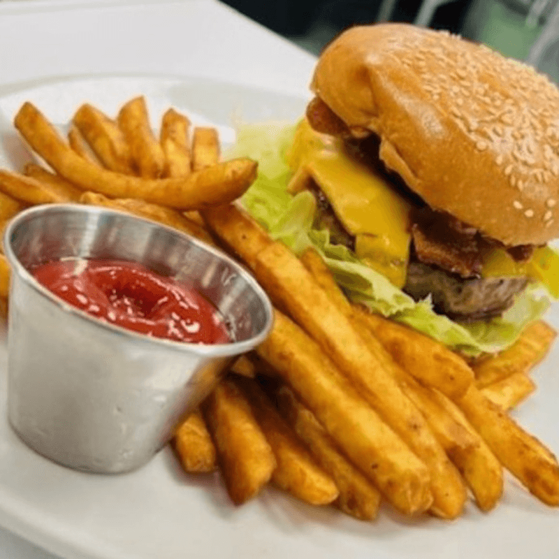 A juicy ⅓ lb. angus beef patty topped with crispy bacon, melted cheese, pickles, lettuce, tomatoes, onions, ketchup, and mayo—stacked on a toasted bun and served with golden fries