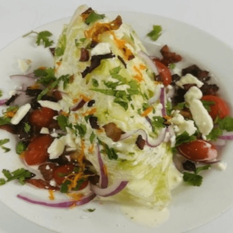 A crisp iceberg wedge topped with smoky bacon, red onions, juicy tomatoes, and seasoned croutons, with our blue cheese dressing