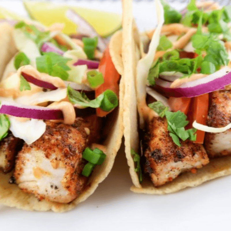 Blackened mahi served in warm tortillas, topped with fresh pico de gallo, red cabbage, and garlic mayo