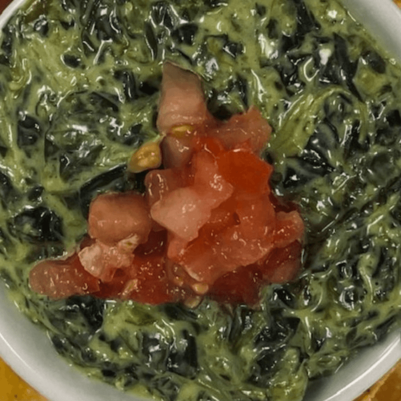 Warm, creamy spinach topped with fresh diced tomatoes. Served with chips