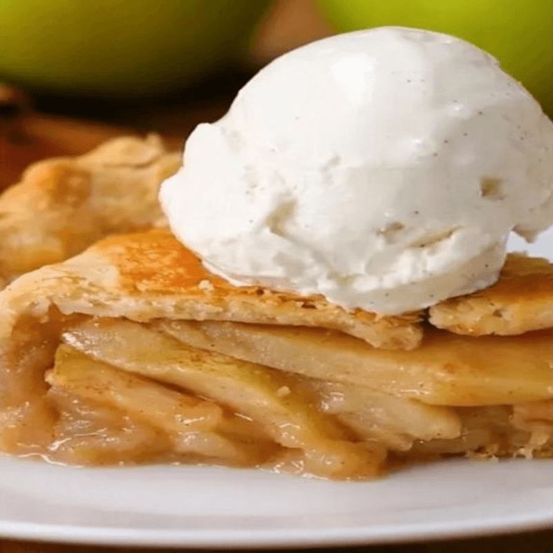 Homemade warm apple pie, not to sweet or tart, drizzled with dulce de leche and served with vanilla ice cream