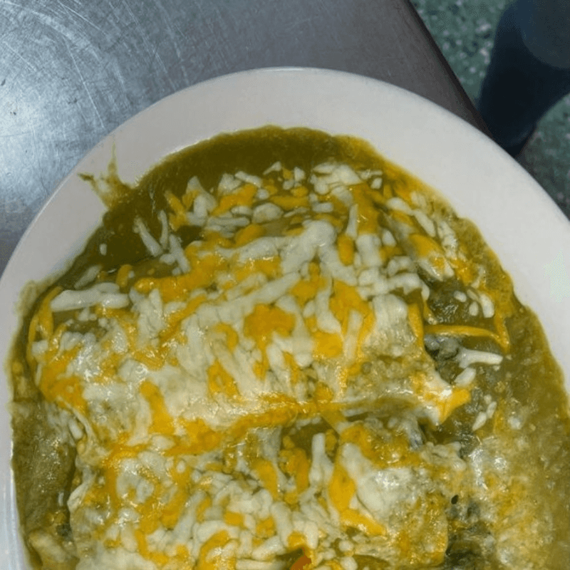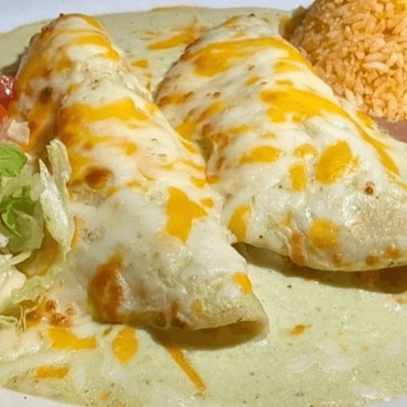 Tender corn tortillas filled with shredded chicken, smothered in a creamy tomatillo green sauce, melted cheese, and a touch of Mexican crema. Served with black beans and fluffy white rice—comforting, rich, and full of flavor, just like home
