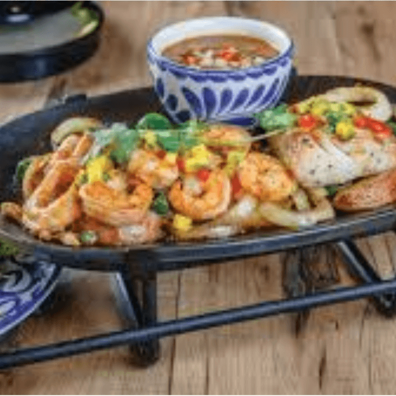 Sizzling shrimp sautéed with peppers and onions. Served with rice, beans, pico de gallo, sour cream, and warm tortillas
