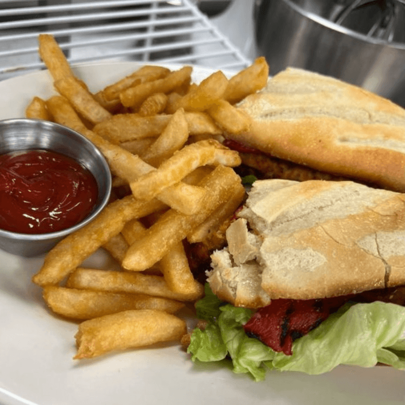 Chicken milanese on a kaiser roll, topped with roasted peppers, lettuce, tomatoes, and mayonnaise. Served with fries