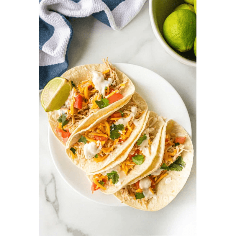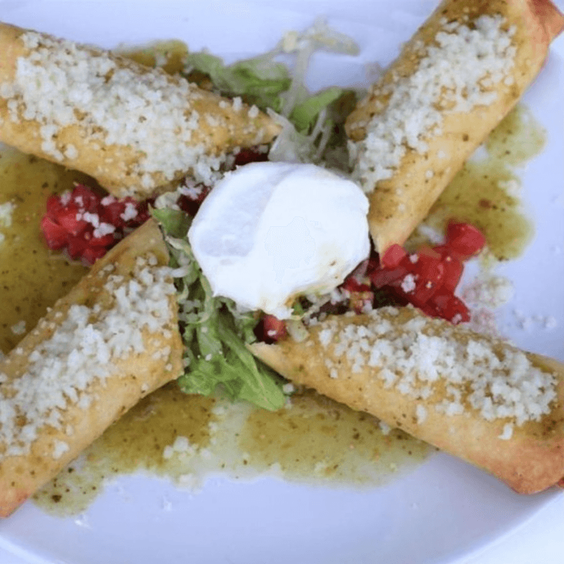 Crispy rolled flour tortillas stuffed with chicken. Topped with green tomatillo sauce, lettuce, tomato, crumbled cheese and sour cream