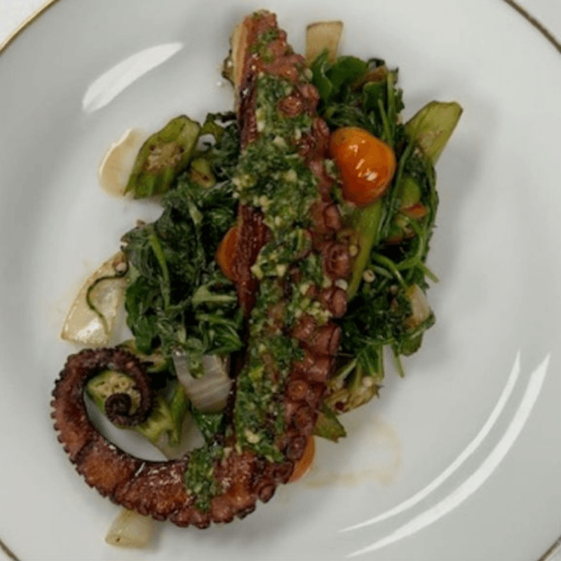 Tender, chargrilled octopus topped with a touch of chimichurri, served over a warm bed of sautéed spinach, onions, and cherry tomatoes. Paired with garlic toast