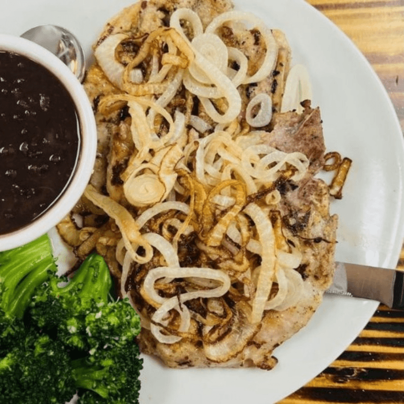 Center-cut pork chops, marinated in our house blend of herbs and spices then grilled, topped with sautéed onions