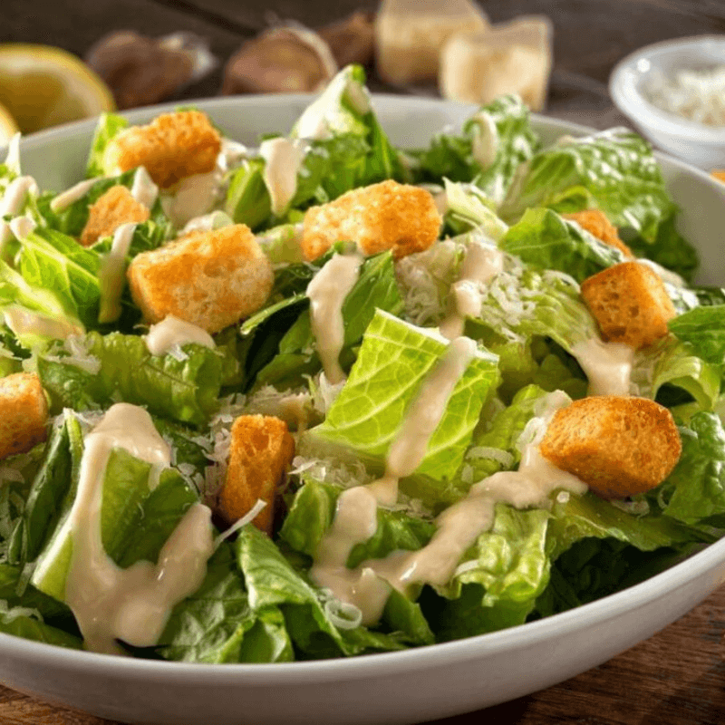 Romaine lettuce tossed with our homemade Caesar dressing, topped with grated Parmesan cheese and seasoned croutons