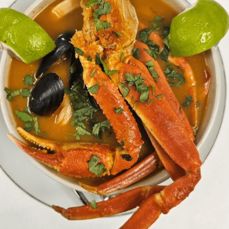 A medley of crab legs, mussels, and shrimp, and fish in a rich, seasoned broth garnished with fresh cilantro and lime wedges. Served with a side of white rice