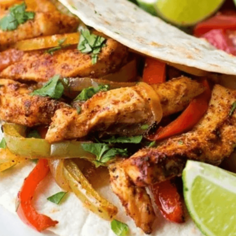 Tender grilled chicken sautéed with peppers and onions. Served with rice, beans, pico de gallo, sour cream, and warm tortillas