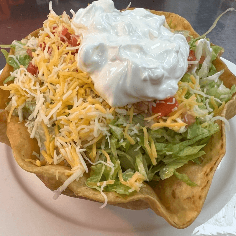 Fresh lettuce topped with seasoned ground beef or grilled chicken, shredded cheese, diced tomatoes, and sour cream. Served with salsa on the side